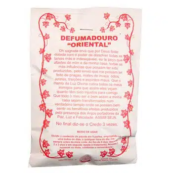 O Defumador de Ervas Oriental é uma mistura poderosa e secreta de ervas secas, elaborada segundo crenças e métodos ancestrais do Oriente, especialmente voltada para a limpeza profunda de pessoas e ambientes. Atua ao nível físico, emocional e espiritual, sendo eficaz na remoção de pragas espirituais, inveja, maldições, azares, ódios e outras formas de negatividade intensa.